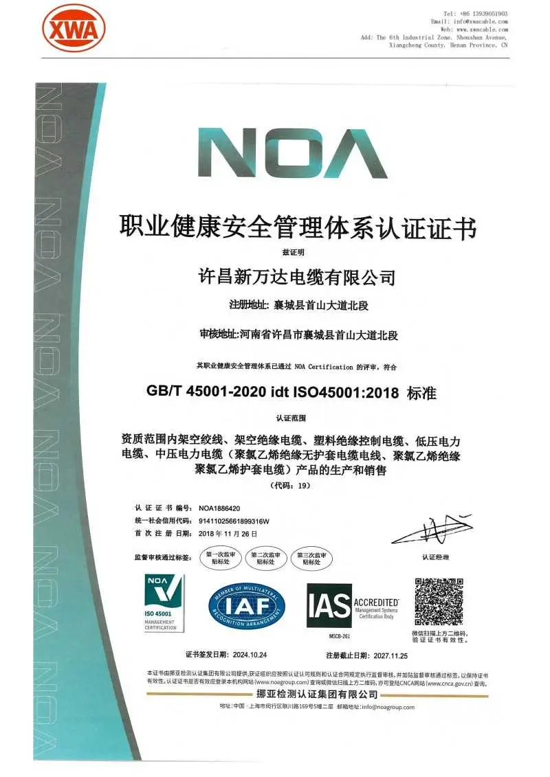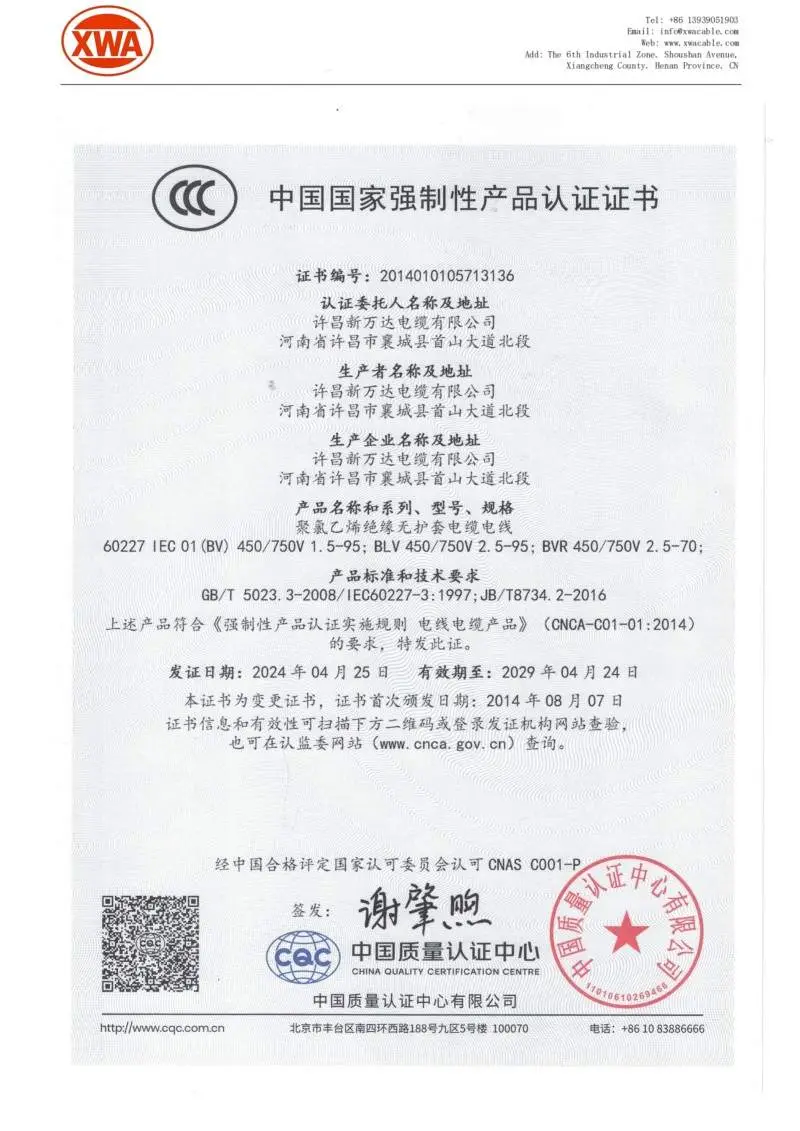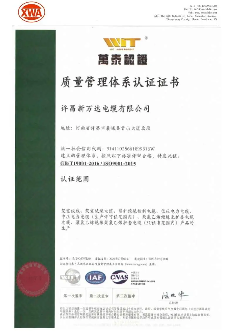 We focus on the construction and continuous improvement of the quality management system. Since 2012, we have successfully passed the ISO9001 international quality system certification and maintained effective operation, establishing a complete and strict quality control system covering the entire industrial chain. Our products have obtained China’s Compulsory Product Certification (CCC Certification), among which transformers have passed CCC certification with complete testing indicators such as insulation performance and temperature rise limit; we also hold the Production Licenses for PVC Insulated Power Cables, PVC Insulated Control Cables, Cross-linked Polyethylene Power Cables and other related products issued by the competent national departments. Complete qualifications and strict quality control ensure the reliability and stability of our products.